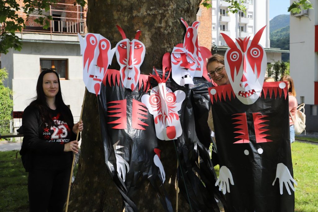 Ustvarjalca KUD-a Strigumigu, Brane Solce in Sanja Fidler, prispevata lutke in maske izdelane na delavnici Rdeča papirada.